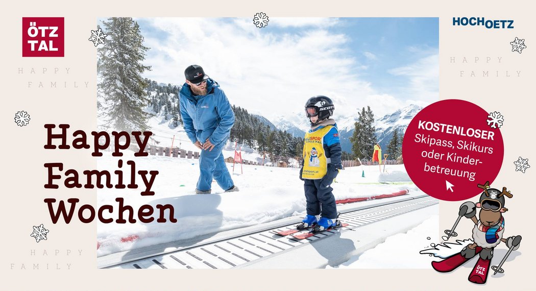 Schnee olé und herzlich willkommen im wunderweiß glitzernden Winterparadies! Bei uns im Hotel Jägerhof verbringen Sie einen unvergesslich schönen Familien-Skiurlaub im Ötztal! Denn kleine Skifahrer werden bei uns zu großen Pistenflitzern. Das Skigebiet Hochoetz ist ein echtes Paradies für schneeverliebte Familien und hat für kleine Gäste so einiges zu bieten. Weite, breite und bestens beschneite Pisten, Übungswiesen, Kinderparks, Skischulen und ein eigener Skikindergarten gleich an der Bergstation lassen einen Familien-Skiurlaub im Ötztal zum unvergesslichen Erlebnis für Groß und Klein werden. Hochoetz begeistert auch mit besonders familienfreundlichen Preisen. Für Kids und Teens bietet das Skigebiet besondere Tarife – Kinder bis sechs Jahre fahren sogar gratis! Sichern Sie sich gleich hier Ihr gemütliches Zimmer im Jägerhof für einen traumhaften Familien-Skiurlaub im Ötztal.